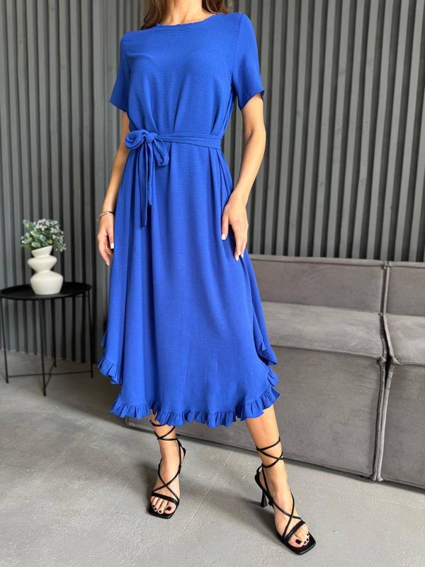 Мод 333 Ткань: американский креп Размеры: 42–44, 46-48, 50-52 Сезон: весна/лето Стильное и женственное платье миди с акцентом на талии. Модель с коротким рукавом, мягкой округлой горловиной и поясом в тон для регулировки посадки. Низ украшен воланами, что добавляет легкости и динамики образу. Идеально подходит для повседневных образов, прогулок или встреч.