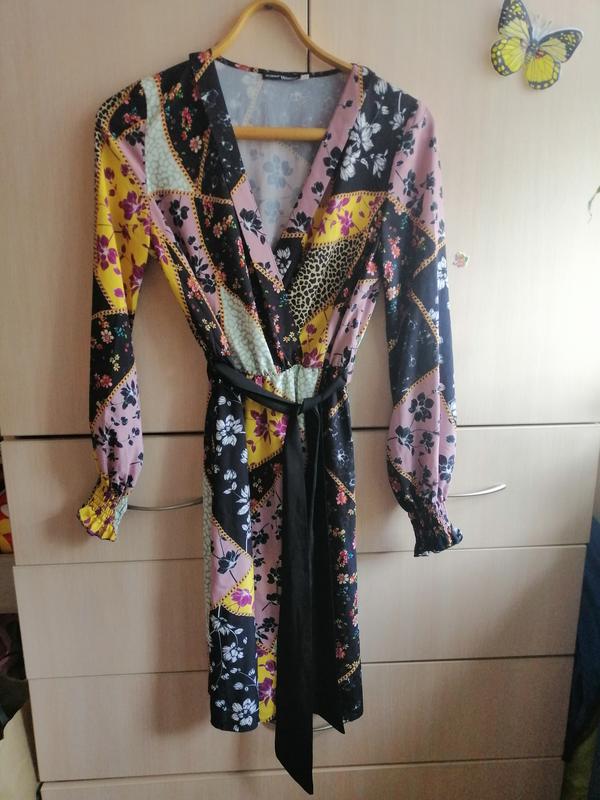 Яркое платье в стиле печворк, в талии на резинке, есть съемный пояс, манжеты рукавов на резинке, без карманов, есть декольте