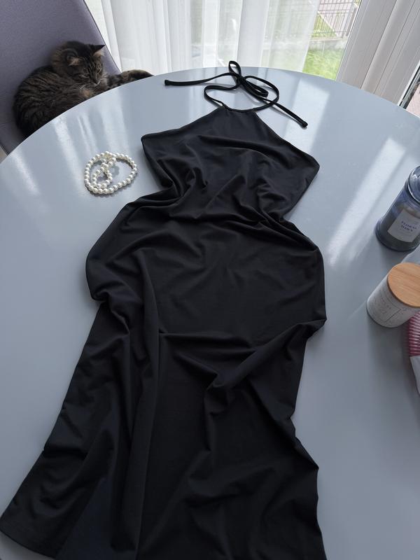 280 грн в інсті, там ціни без комісій, нік такий як тут Чорне плаття з завʼязкою навколо шиї Дуже приємне до тіла Не просвічує Рр с Талія-35 Груди- 37 Бедра-46 Довжина від шиї 92