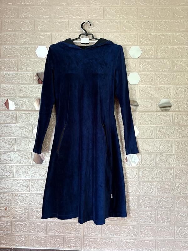 Велюрова сукня плаття міді синього кольору з капюшоном розмір s m з двома кишенями