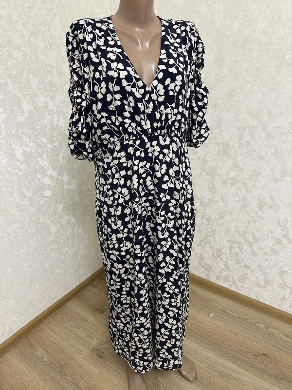 Чудова віскозна сукня на підкладці. Чорна в білий принт .Є кишені.Збоку застібається на блискавку. Виміри: ПП 45 ПГ 57 ПТ 48 ПС 70 Довжина 132 Рукав 44