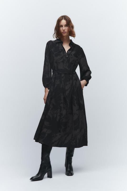 Сукня від ZARA, з останніх колекцій, розмір вказано M. Є кишені, на гудзиках до талії, є поясок який знімається. Склад: 100% віскоза. Заміри: Довжина по спині 124-124,5 см; Рукав від горловини 64-65 см; Пог ( від одної подмишки до іншої ) 48-49 см; Пот 45 см, регулюється на менший пояском; Поб 64 см +/-.