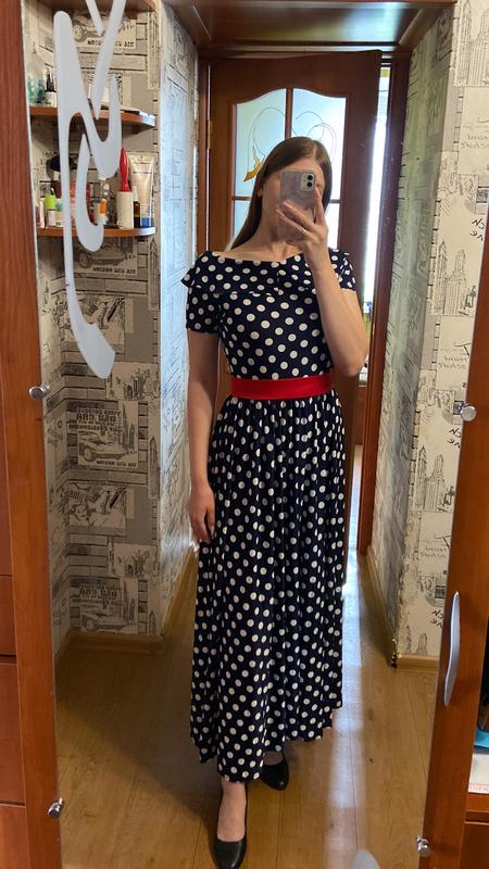 Сукня в горошок, з відкритими плечима, в комплекті з червоним поясом, на талії резиночка, яка добре тягнеться Розмір S/M Стан нового
