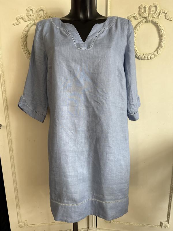 Якісна літня сукня напівприлігаючого сілуета. Колір блакитно-світло фіолетовий. Склад:льон-100/.Розмір по бірці-14. Заміри: довжина-90 см, ПОГ-53 см, ПОБ-55 см, рукав-3/4.Льон якісний. Сукня чудова, є незначний нюанс-див. Останнє фото-(начебто від кулькової ручки). Треба випрати.