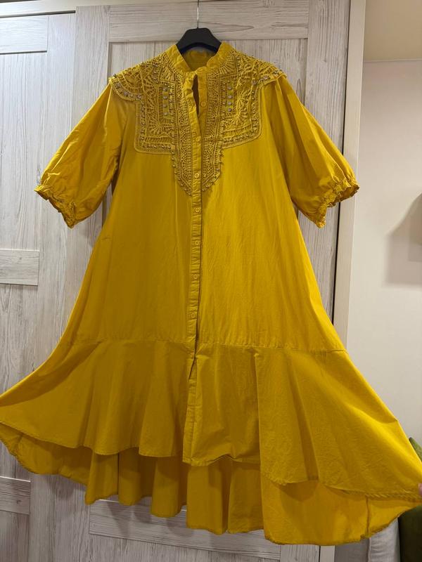 Обхват груди до 120 см., длина рукава 40 см., длина платья спереди 103 см., длина сзади 117 см. Спереди застегивается на пуговицы, на рукавах есть тоненькая резиночка.