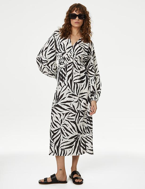 Ця чайна сукня з принтом завдяки об'ємним рукавам стане яскравим доповненням до вашого гардеробу. Вона має стандартний крій та хвилясту спідницю міді. Цей жіночний дизайн має V-подібний виріз та силует з приталеною талією.