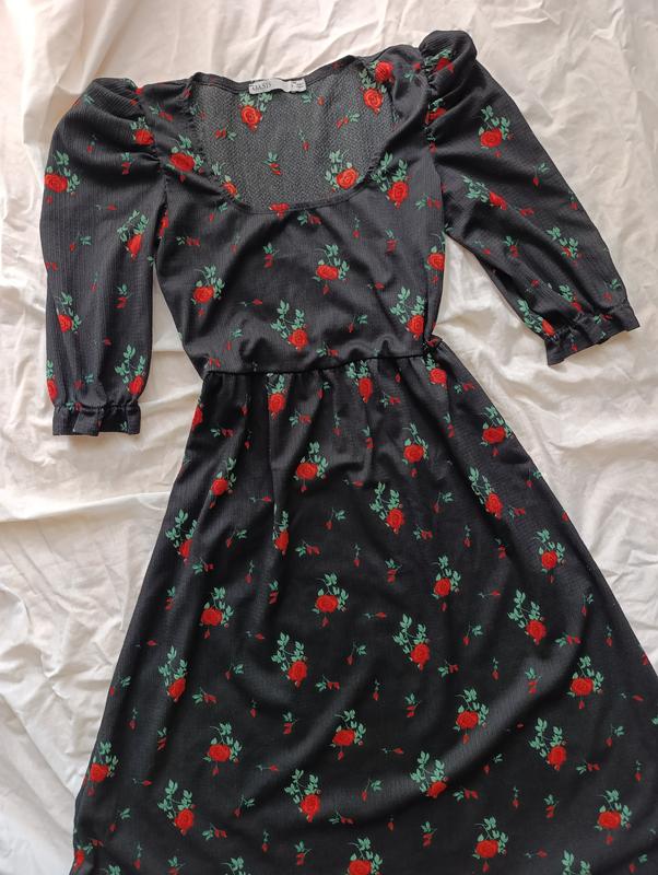 Невероятно красивое платье на лето для прекрасной барышни. Размер S, но подойдет и на М. Длина - миди. Черный цвет, цветочный (розовый) принт. Рукави-фанарики. Подробные замеры: • длина от плеча до низа - 108 см • талия (полный обхват) - 72 см (дополнительно тянется, так как вшитая резинка) • плечи (спереди) - 32 см