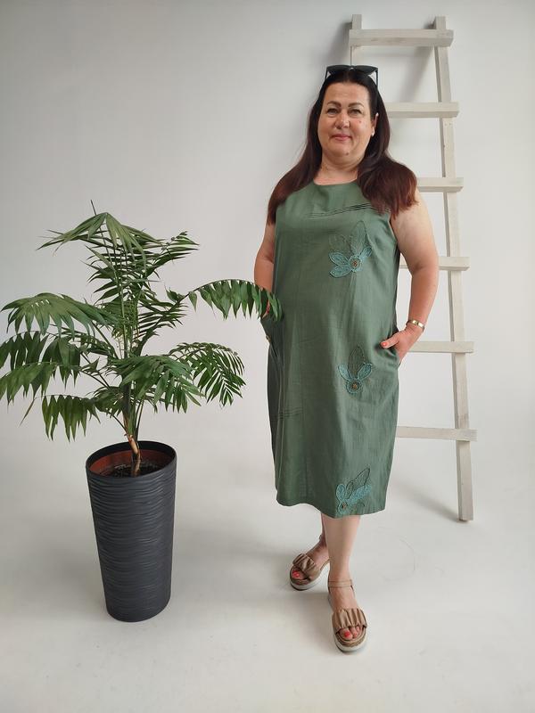 Легкое и невесомое платье миди зелено-оливкового цвета Производство Турция🇹🇷 Нежный и легкий лён + вискоза Дышащая ткань, в жару очень комфортно в нем Размеры все в наличии По вашим замерам подберем вам необходимый размер Цветочный орнамент нашивка и карманы по бокам добавляют стиля платья.