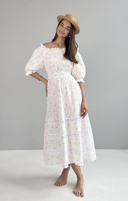 Муслиновая ткань Бавовна 100% Рост модели 174 см Длина изделия по боковому шву 108 см Длина рукава 40 см Обхват по линии груди 100 см Обхват по линии талии 46 см Талия на резинке, обхват в растянутом виде 96 см Обхват по линии бедер 130 см Все параметры указаны на размер S С каждым размером объем увеличивается на 4 см. Работаем по полной плате, есть обмен и возврат Наявность уточнюйте!