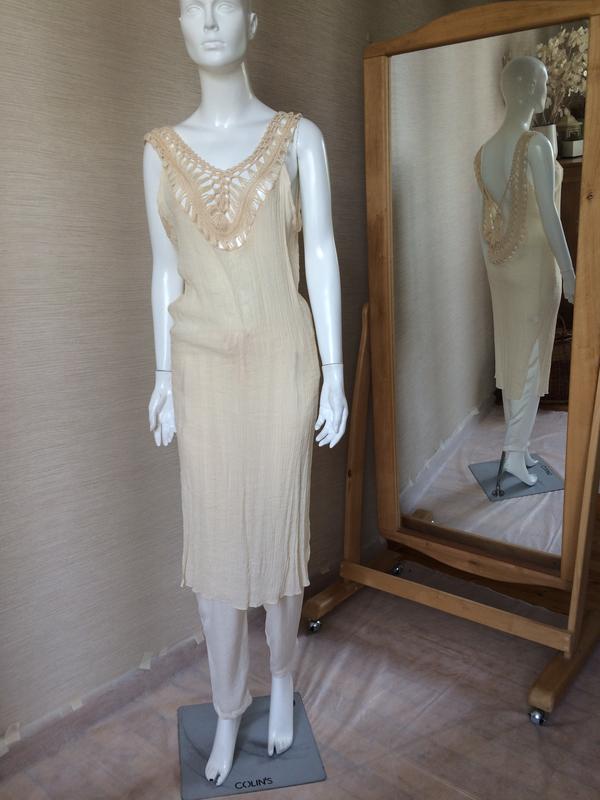 Одетая на манекен размер 44. Указан размер 8, манекен размер 8. Ткань плетения жатка, замеры предоставлены в свободном состоянии, шье тянется: Состав: вискоза, полиэстер Длина 117 см, ПОГ 45 см, ПОБ 45 см, по бокам разрезы глубиной в 30 см