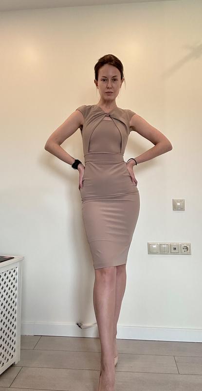 Коктейльное платье Sassofono, размер XS, бежевого цвета. Платье с подкладкой на застежке-молнии сзади. Ткань тянется, поэтому подойдет для девушек размера XS-S при условии небольшого объема в груди и бедрах. На платье указан размер 36. Но для мое бедер уже немножко затуго. Материал: 88% полиэстер, 12% эластан. Надела 2 раза, состояние идеальное, без повреждений и следов использования. Параметры модели на фото: рост 175 см, объемы 85-65-93