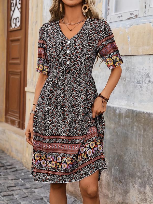 Милое и модное платье в стиле бохо от SHEIN, р. 46, V-образный вырез, рукав 3/4 с эластичным манжетом, складки на груди, пуговицы, свободная талия, короткая длина, цветочный принт, винтажный стиль, создающий привлекательный образ! Из вискозы, легкая и приятная к телу, с хорошей воздухопроницаемостью. Удобный крой - просторный, красивый и легко одевается и снимается. Подходит для летнего отдыха, пляжа, ежедневной повседневной носки, клуба и др. Замеры: ширина плеча- 6,5 см., длина рукава- 29 см., ПОГ- 43 см., ПОТ- 42 см., ПОС до 58 см., общая длина- 92 см., б/в идеальном состоянии, цена- 340 грн.