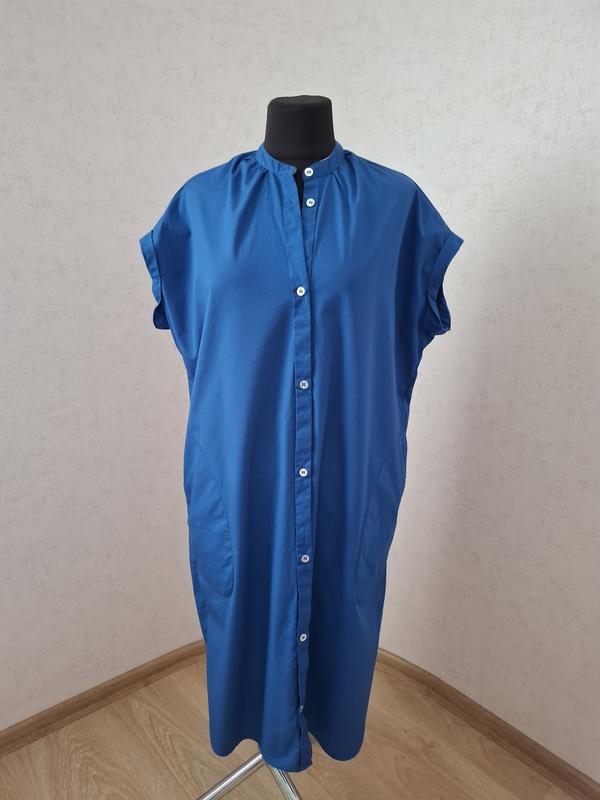 Женское платье из чистого хлопка Воротник-стойка Короткий рукав + Перекрытие на конце рукава Слегка опущенные плечи Застегивается на пуговицы Закругленный подол Однотонные цвета Пуговицы брендированные Есть карманы Прямой крой ПО груди 57-58см ПО бедер 60см Длина 99см Стан - идеальный