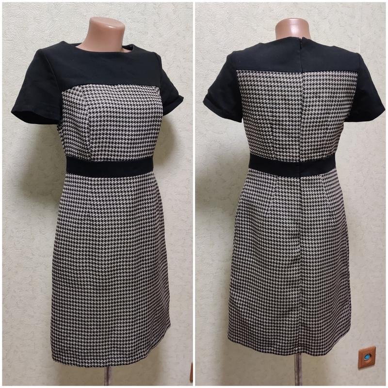 Универсальное платье, которое может быть и классическое / разделительное, так и повседневное, или для особого дня Красивое сочетание черного цвета и принта в гусиную лапку На спине есть молния На бирке указан размер S/8 Замеры: длина 91, под руками 43, пояс 37, бедра 49