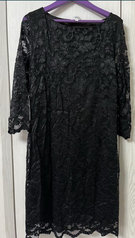Чорна сукня з гіпюру. Розмір М. Склад: 92% - нейлон; 8% - еластан. Підкладка- 100%- поліестер. Довжина гіпюру - 88 см. Довжина підкладки - 80 см. Рукав - тричетверті. Обʼєм грудей - 78 см.