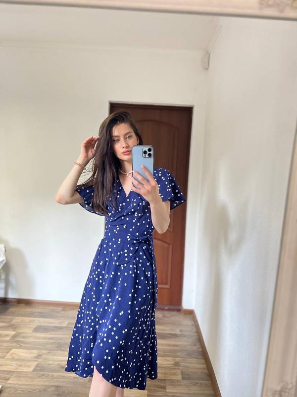 Сукня на запах , асиметрична; спереду короче Плечі 38 см Рукавчик 19 см Пог 43 см+ запах, можна регулювати Пот 33+ запах Поб 60+ Довжина по спинці 116 см( 38+ 78)