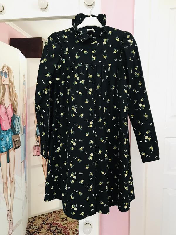 Очень красивое брендовое платье балахон с нежным цветочным принтом в отличном состоянии. Воротник стойка, рукав фонарик, книзу на пуговицах, насыщенный черный цвет. Можно носить под поясок. Рост 165/88А. Без дефектов. Спинка 32см, рукав 61см, ПОГ 50см, длина от воротничка 88см.