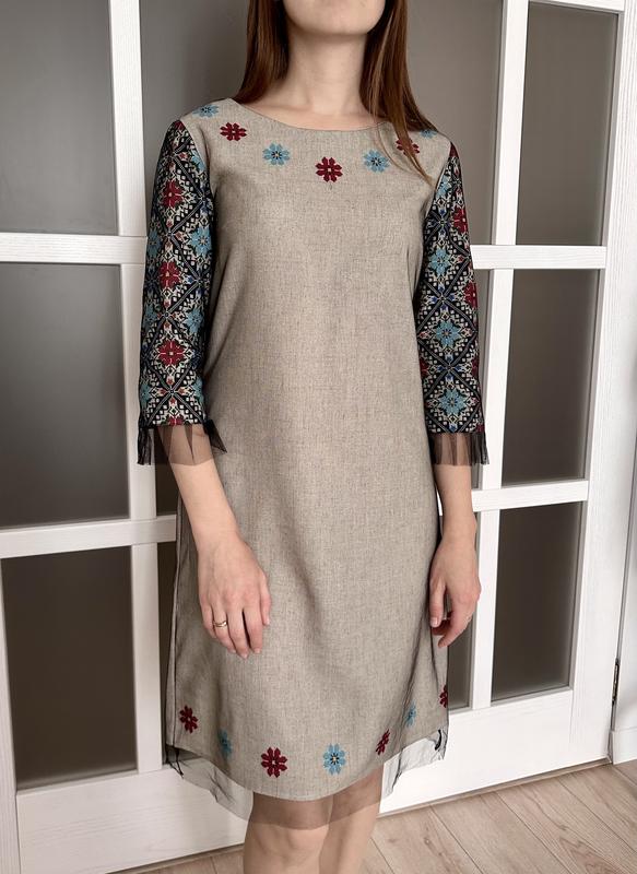 Оригінальна вишита сукня з льону розміру S, ручна робота, покрита чорною сіткою