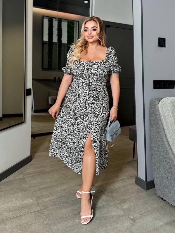 Модель 5317/1 Жіноча сукня у батальних розмірах Розмірний ряд 2ХЛ,3ХЛ,4ХЛ,5ХЛ Тканина штапель Кольори біла основа +чорний та блакитний Супер якість Застібається на блискавку Ціна 629грн