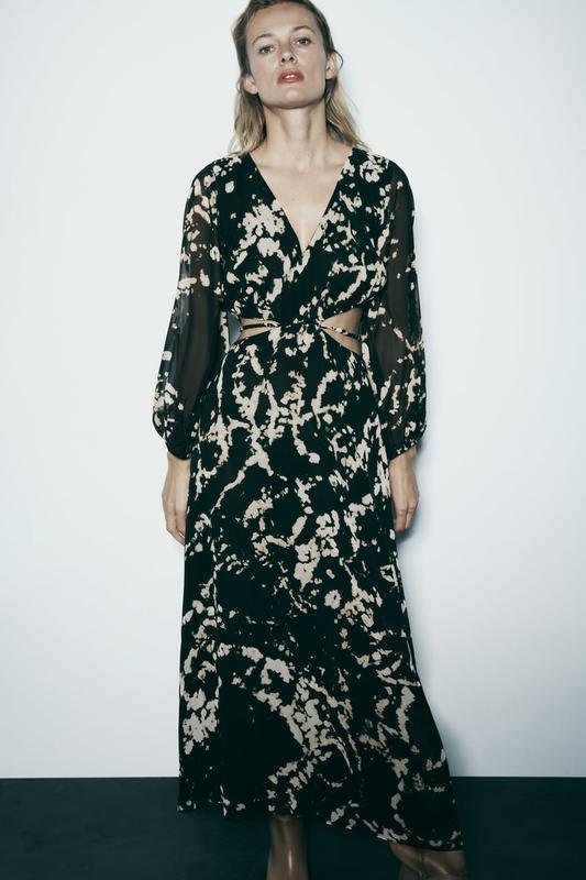 Платье с V-образным вырезом, длинными рукавами и подкладкой. Застегивается на скрытую молнию сзади. Боковые вырезы с эластичными ремешками на талии и резинка внизу на рукавах. РАЗМЕР S: ✅ Плечи - 40 см ✅ Рукав - 58 см ✅ ПОГ - 51 см ✅ПОТ - 36 см ✅ПОБ - 55 см ✅ Длина - 128 см ✅Состав: 100% полиэстер