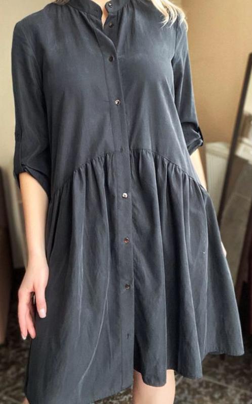 70%ліоцел 30% поліестер Рукав вкорочений , підкочується і фіксується По бірці xs, можно на s -m Плечі 38,5 Груди по 46 см Стегна 55 + см (вільно ) Довжина 86 см