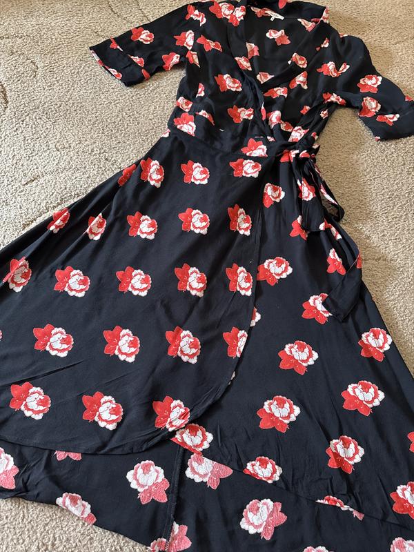 В носке не было. Оригинал На запах . Длина от плеча спереди 104, сзади 116, длина рукава 28, пог 47, юбка клеш 55