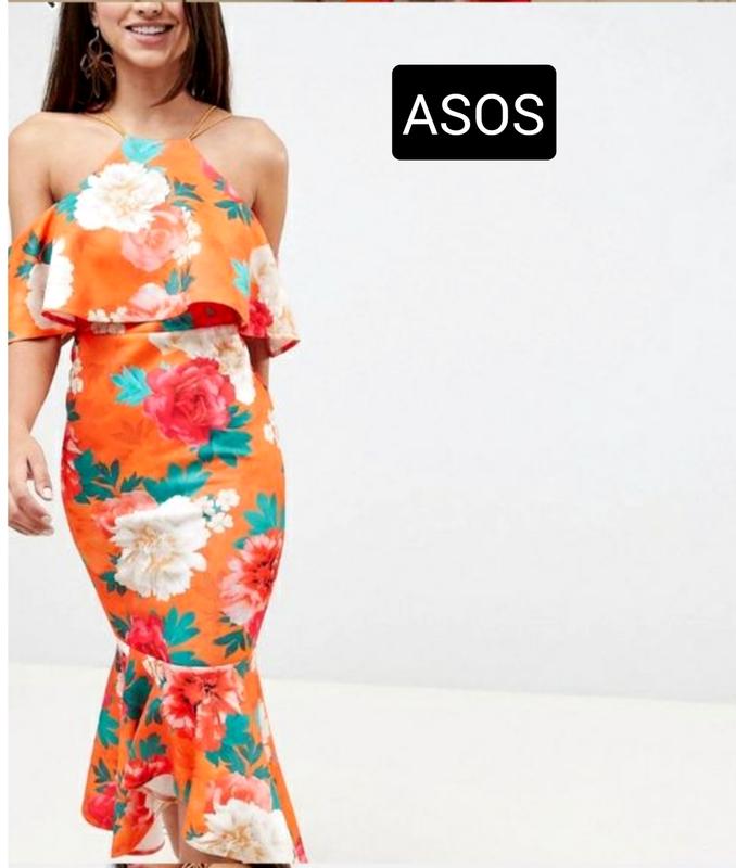 Платье женское миди оранжевого оранжевого на в цветочный принт на бретелях от бренда asos...