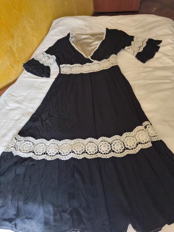 очень нарядное платье с кружевом талия на резинке, что подчеркивает женственность длина от плеча вниз 120 см, полуобхват груди 45 см талия на резинке 31 тянется до 36 и в обхват бедер 50 см,снизу подклад