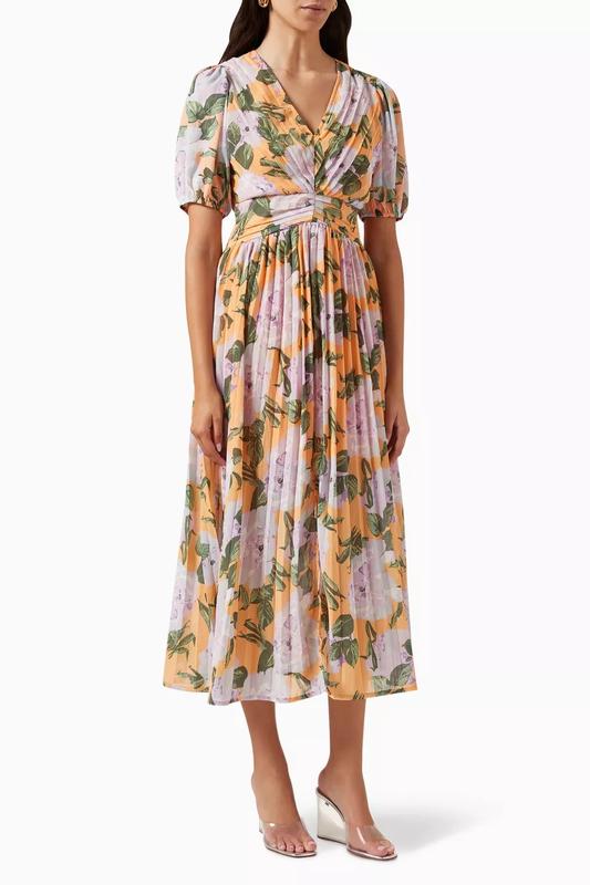 Коли елегантність у центрі уваги! Гарна плісована сукня з квітковим принтом по всій довжині. Короткі пишні рукави та приталений крій надають сукні привабливості - нам це подобається! Ідеально підходить для вишуканої компанії цього сезону в поєднанні з аксесуарами відповідних кольорів.