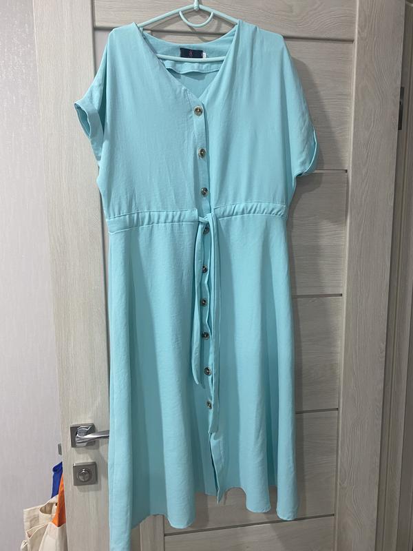Сукня з тканини креп-жатка, ґудзики діючі , мʼятного кольору, довжина міді . Пояс на кулісці корегує талію сукні до необхідного розміру . ОГ-55 В стегнах вільно Довжина 112