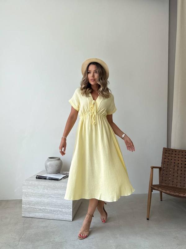 Мод 347 Тканина: муслін Розміри: 42–44,46-48,50-52 Сезон: весна/літо Ціна: 900 грн Ця легка сукня міді — втілення елегантної простоти. Виготовлена з легкої текстурної тканини, вона забезпечує комфорт навіть у спекотні дні. Фасон має V-подібний глибокий виріз із зав’язками спереду, які створюють акцент на грудях та дозволяють регулювати глибину декольте. Завищена талія візуально подовжує силует, а м’яка спідниця вільно спадає до середини литки, створюючи ніжний і невимушений образ. Рукава короткі, з легким об’ємом, що додає трохи романтичної жіночності. Ідеально підходить для: • літніх прогулянок; • відпочинку на курорті; • романтичних зустрічей; • неформальних заходів.имма