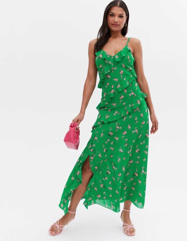 Шифоновое платье миди с рюшами и зеленой розой от New look. размер S,M