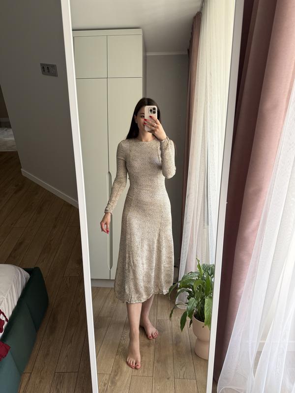 Дуууже красиве плаття в горох від zara Золотисто-бежевого кольору, тканина ніби в дрібну жатку Ззаду на замку Без дефектів Розмір XS, тягнеться до S Одягнене на 87-67-97, 168 Заміри (тканина тягнеться за рахунок того, що вона жата) Рукав 58 Груди 44 Талія 35 Бедра 50 Довжина 122