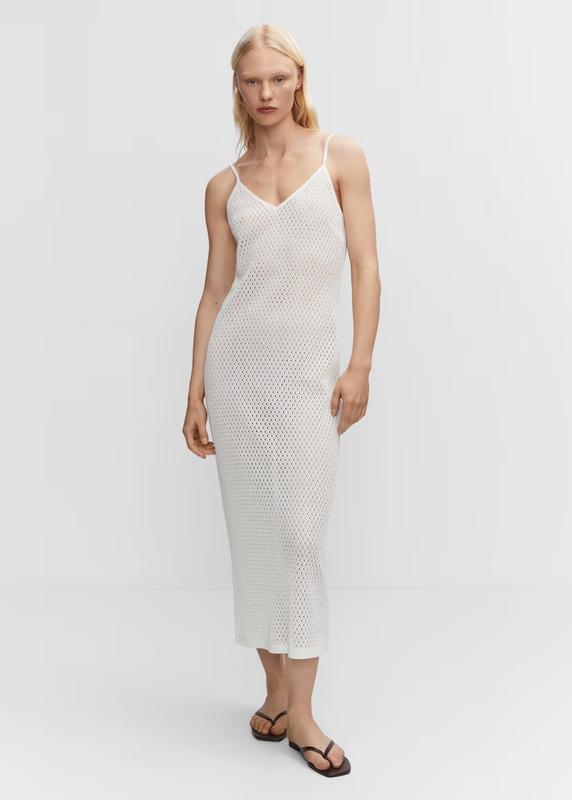 Ажурний трикотаж. Приталений крій. Довга модель. Декольте. Тонкі бретелі. Виріз на спині. Без застібки. 66% поліестер. 34% бавовна. S, L в наявності Чудова якість