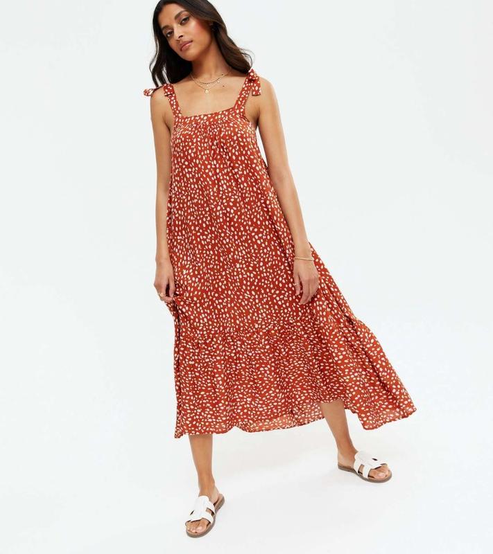 Миди-сарафан от New Look с выразительным дизайном. Мягкий терракотовый цвет с мелким белым принтом. Легкий материал - 100% вискоза. Свободный крой с завязками на плечах. В новом состоянии Размер UK 8/S. Длина 123 ПОг 45 ПОт - свободно Пол - свободно