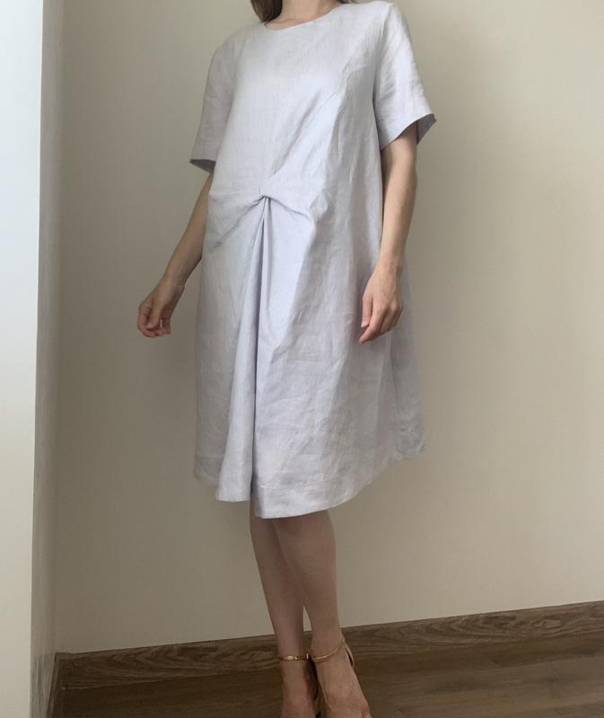 Новое платье. Отличное качество льна. Длина спереди (через асимметричный узел) 99 см, сзади 96 см. Боковые карманы. Молния на спинке. ПОГ 54 см. ПОС 58 см. Рукав от плеча 24 см. Светлый серо-синий цвет.