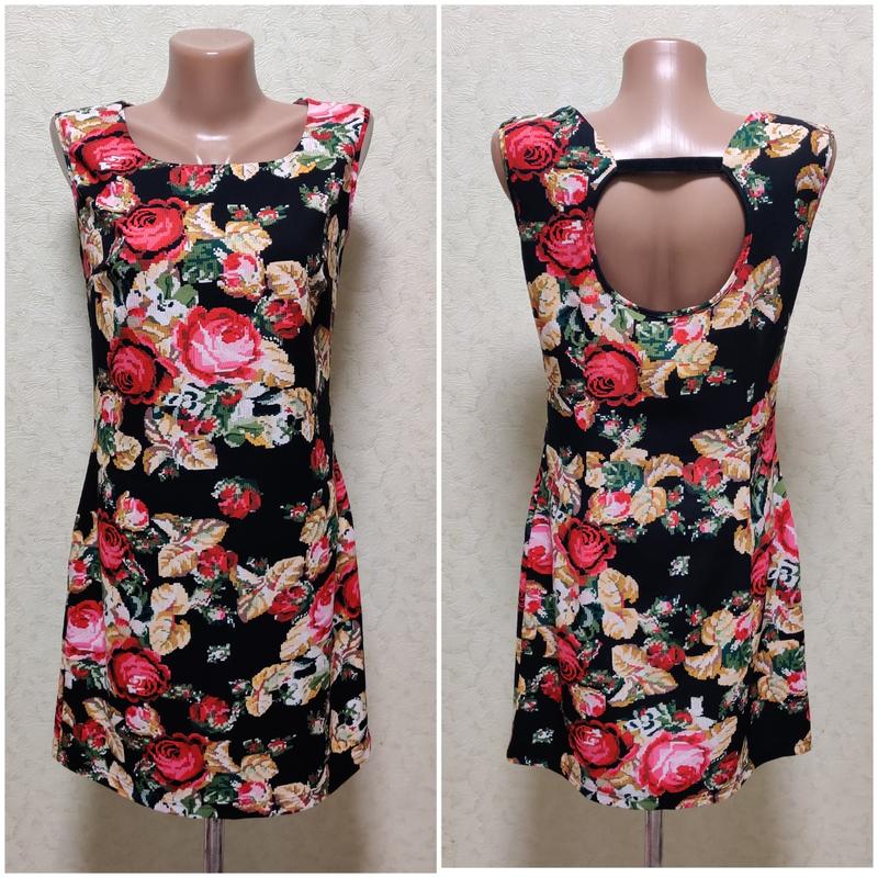 Красивое платье с вырезом на спине Принт - вышитые крестиком цветы, насыщенные и яркие цвета На бирке указан размер 38 Замеры: длина 83, под руками 46, пояс 40, бедра 49