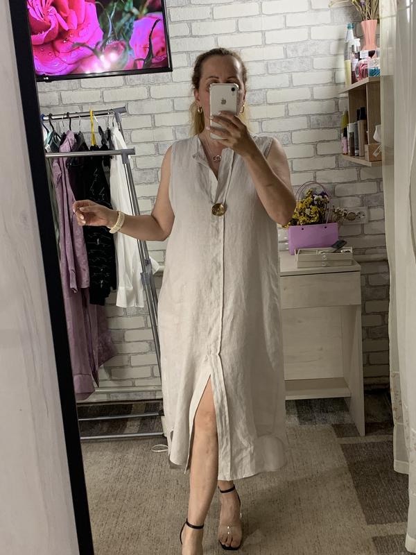 Лляна сукня в новому стані, легенька, асиметрична, крой надто цікавий! Колір також вдалий, не вибілений 100% льон. Розмір приблизно XL, дивіться заміри! По грудях 57, стегна 62, довжина 112-127 см