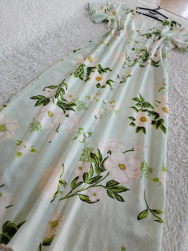 Нежное мятное платье из смесевого льна Primark. Короткие широкие рукава. По всей длине идет на пуговках. 85% вискоза 15%лен. Размер 10 Длина 130 пог 48-50 пот 43 поб 50