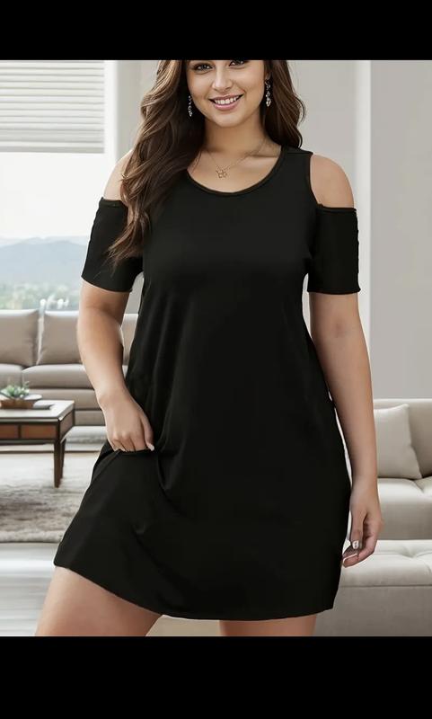 Елегантна Літня Сукня з Відкритими Плечима для Жінок Plus Size - Однотонна, Еластична та Облягаюча зі Круглим Вирізом