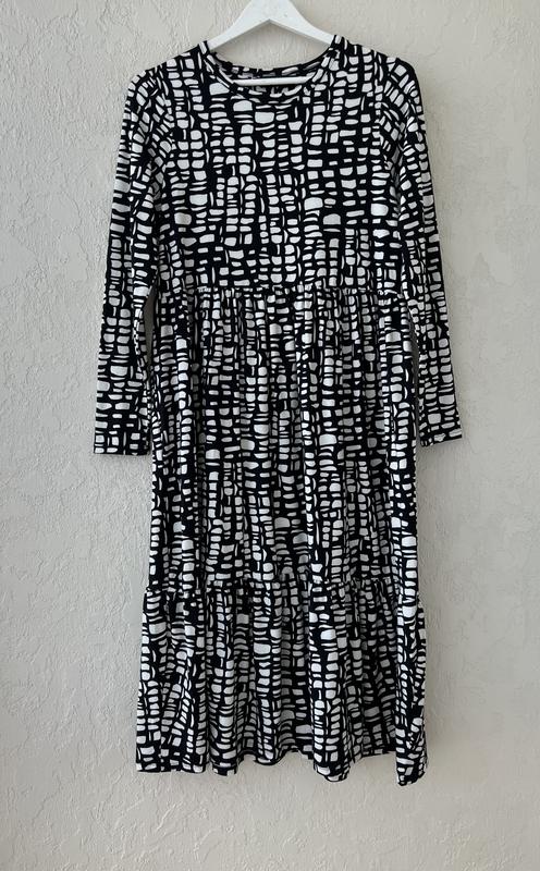 Код: 691 Жіноче плаття, фірми F&F, розмір Uk12, Eur40, підійде на наш 46 розмір, тканина 90% поліестер, 10% еластан, мягенька, гарно тянеться, спадаюча, не мнеться. Довжина 117 см, в плечах 38 см, в грудях 48 см, довжина рукава 62 см. Б/у стан нового Ціна: 450 грн