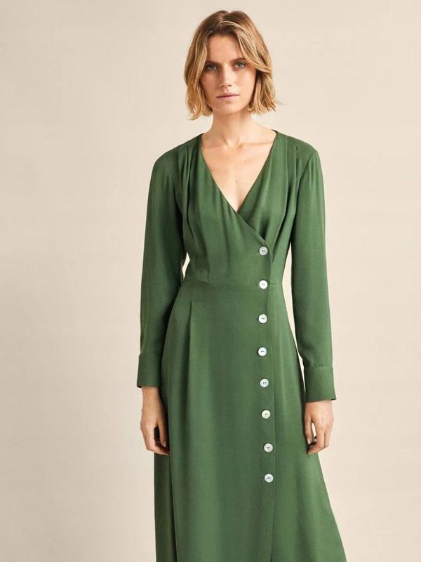 стильное брендовое платье красивого приглушенного зеленого цвета из качественной ткани вискоза, модель длины миди, v-образный вырез горловины "на запах", по 2 защипа на плечах, застегивается на крупные перламутровые пуговицы (не по центру, пайку сбоку, с второго защипами, также защипы сзади по талии), рукав на манжете, линия плеч 40, грудь ПО 55, талия 40 в области бедер 60, низ 75, длина от плеча 122, рукав от шва 60. указан размер 40 европейский, подойдет на Л.