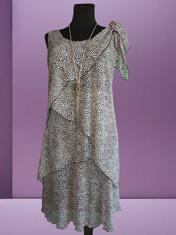 | Сукня, заставляющая время остановиться... или же вернуться на 100 лет назад! ⠀ Она — словно со страниц романа о Большом Гэтсбе... Платье в ретро стиле от французского бренда Cop.Copine - идеальный выбор для тех, кто хочет выглядеть изысканно, грациозно и небанально. ⠀ 🔸 Четыре разноуровневых слоя легкого шифона создают подвижный, привлекательный силуэт. 🔸 Черный трикотажный подклад визуально струнит фигуру. 🔸 Изысканный сменный кожаный аксессуар на кнопках — это простор для фантазии: ▫️ снимай и завязывай бант на плече ▫️ украшение брошью, цветами или перьями ⠀ 📌 Бирки срезаны 📌 На ощупь - вискозный шифон 📌 Нижнее платье - вискозный или хлопковый трикотаж ⠀ 📏 Размер: приблизительно M-L-XL 📐 НОГ: 48–53 см НОТ: 42–47 см НОС: 53–58 см Пройма: 26 см Длина по спинке от плеча: 97 см ⠀