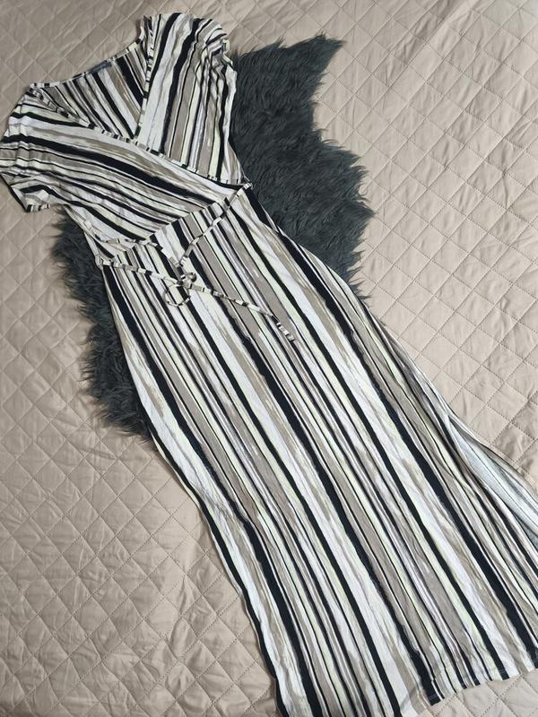 Отличное платье для лета! с одной стороны разрез есть поясочек имитация на запах. актуальные цвета желтый сливочный + беж. Длина 140, на уровне бедер 55, пояс 38 пог около 50 ( крой летучая мышь). очень красиво тянется, состояние супер!