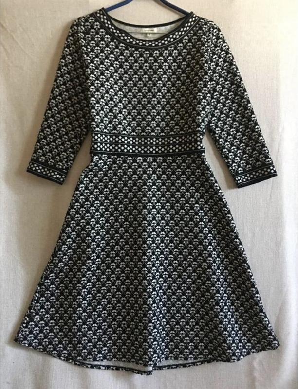 Фактурный жаккардовый трикотаж в черно-белый принт, На ощупь мега приятный, эластичный, теплый Платье без подкладки Силуэт приталенный с расклешенным к низу Крой отрезной по линии талии Рукави 3/4 Длина до талии 42 см длина юбки 60 см плечи 38 см длина рукава 47 см ПОГ 48 см ПОТ 38 см ПОБ 50 см ПО низу 80 см