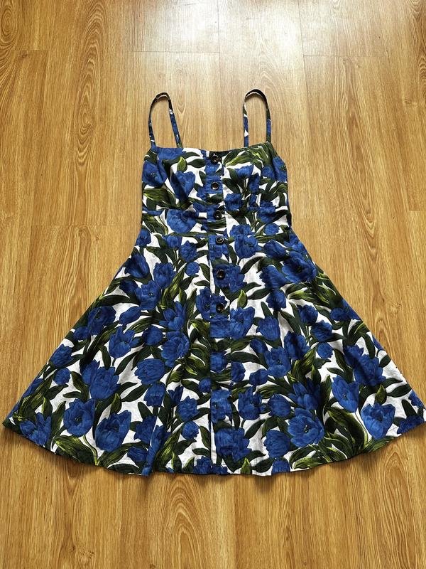 Розмір по бірці M/L (але краще орієнтуватись по замірам, більше підійде на S) Довжина від верху грудей 64 см Напівобʼєм грудей 34 см Напівобʼєм талії 32 см (ззаду резинка, тож трохи потягнеться і в зоні грудей, і в талії) По стегнам вільно. Тканина 100% бавовна, дуже гарний насичений принт.