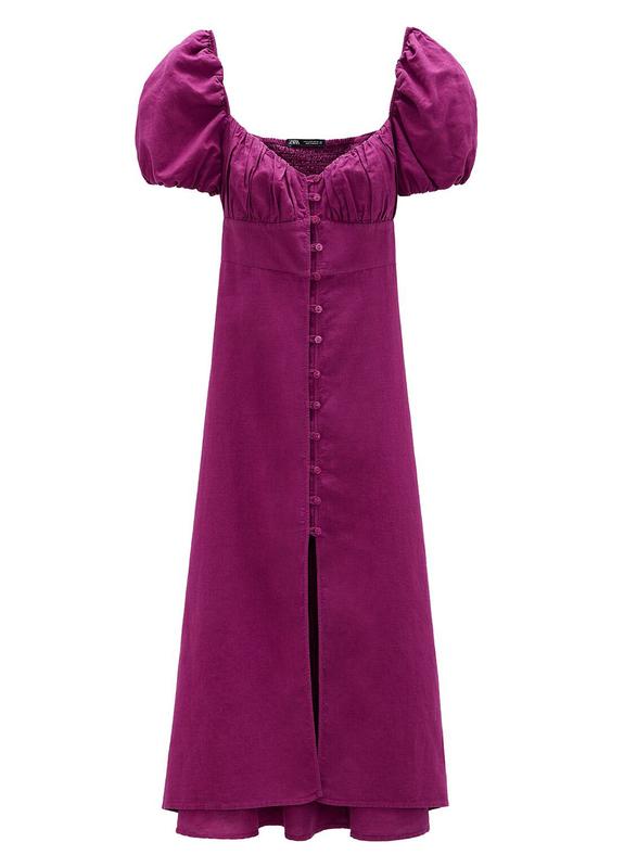 Платье миди Zara. Размер XS. Склад: 53% льон, 47% котон. На пуговицах, рукава фонарики, можно спускать с плеч, держатся на резинке. Состояние новой, одевали несколько раз. Длина от плеча 124см, ПО талии 34см.