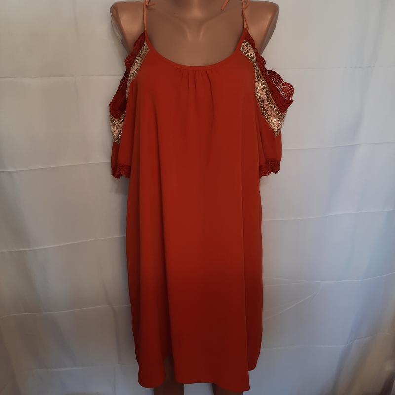 Платье с обнаженными плечами. Рукава отделаны кружевом и пайетками. Стан идеален. Довжина 78 см(без бретельок), Пог 56 см, Пот 58 см, Пос 61 см. УП, НП.