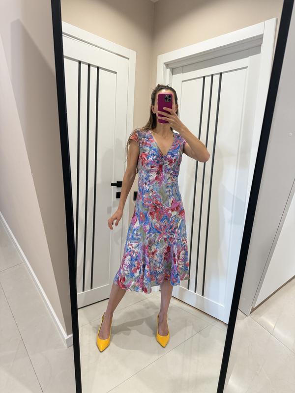 Сукня зі 100% льону Стан ідеальний Фото на мені з параметрами: Окружність грудей – 87 см. під грудьми – 74 см. Обхват талії – 68 см Обхват стегон - 94 см Зріст 168 Заміри сукні: плечі 38,5 см У грудях 46 см Талія 42,5 см Довжина від плеча 114 см