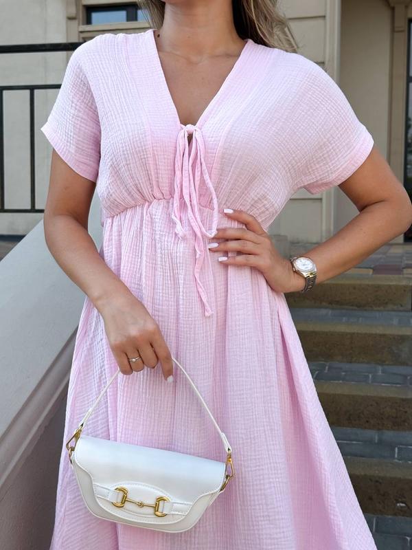 Додали новий колір🥳 Мод 347 Тканина: муслін Розміри: 42–44,46-48,50-52 Сезон: весна/літо Ця легка сукня міді — втілення елегантної простоти. Виготовлена з легкої текстурної тканини, вона забезпечує комфорт навіть у спекотні дні. Фасон має V-подібний глибокий виріз із зав’язками спереду, які створюють акцент на грудях та дозволяють регулювати глибину декольте. Завищена талія візуально подовжує силует, а м’яка спідниця вільно спадає до середини литки, створюючи ніжний і невимушений образ. Рукава короткі, з легким об’ємом, що додає трохи романтичної жіночності. Ідеально підходить для: • літніх прогулянок; • відпочинку на курорті; • романтичних зустрічей; • неформальних заходів.
